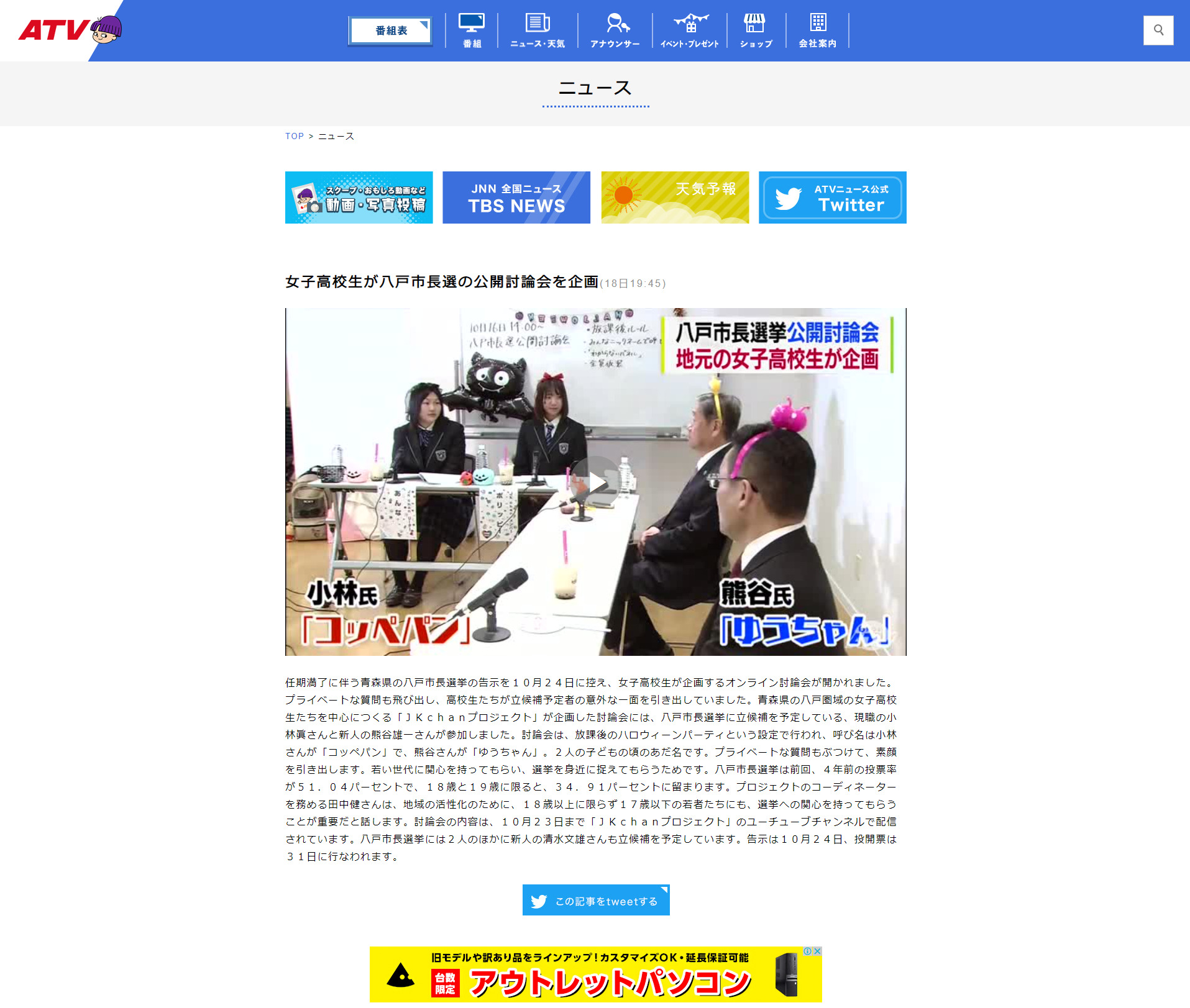 2021年10月16日(土)に開催された「JKchanが八戸市長選挙立候補予定者とおしゃべりするヤバい公開討論会」に関するニュースが、青森県のTBS系列局ATV青森テレビのニュース番組「わっちNEWS(2021年10月18日放送分)」で紹介されました♪